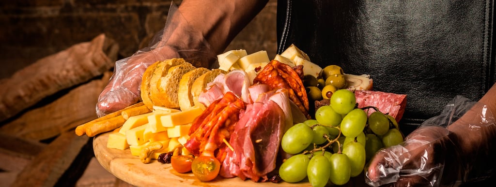 Hamburgo, Serrano, Salami, Chorizo Español; Queso Suizo, PepperJack, palitos tostados, dip, aceitunas, uvas, nueces y arándanos.