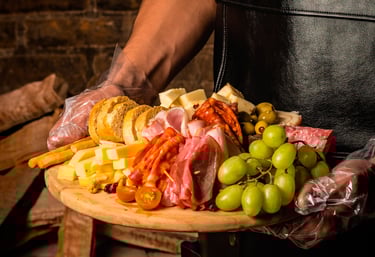 Hamburgo, Serrano, Salami, Chorizo Español; Queso Suizo, Mozarela, PepperJack, palitos tostados, dos dips, aceitunas, uvas, tomates cherry, nueces y arándanos.